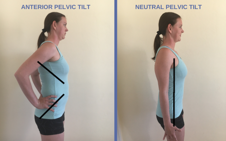 An anterior pelvic tilt is when the top of the pelvis drops forward and the bottom of the pelvis (tailbone) lifts up behind the body. It can also look like an overly pronounced low back curve, or the belly poofing forward.